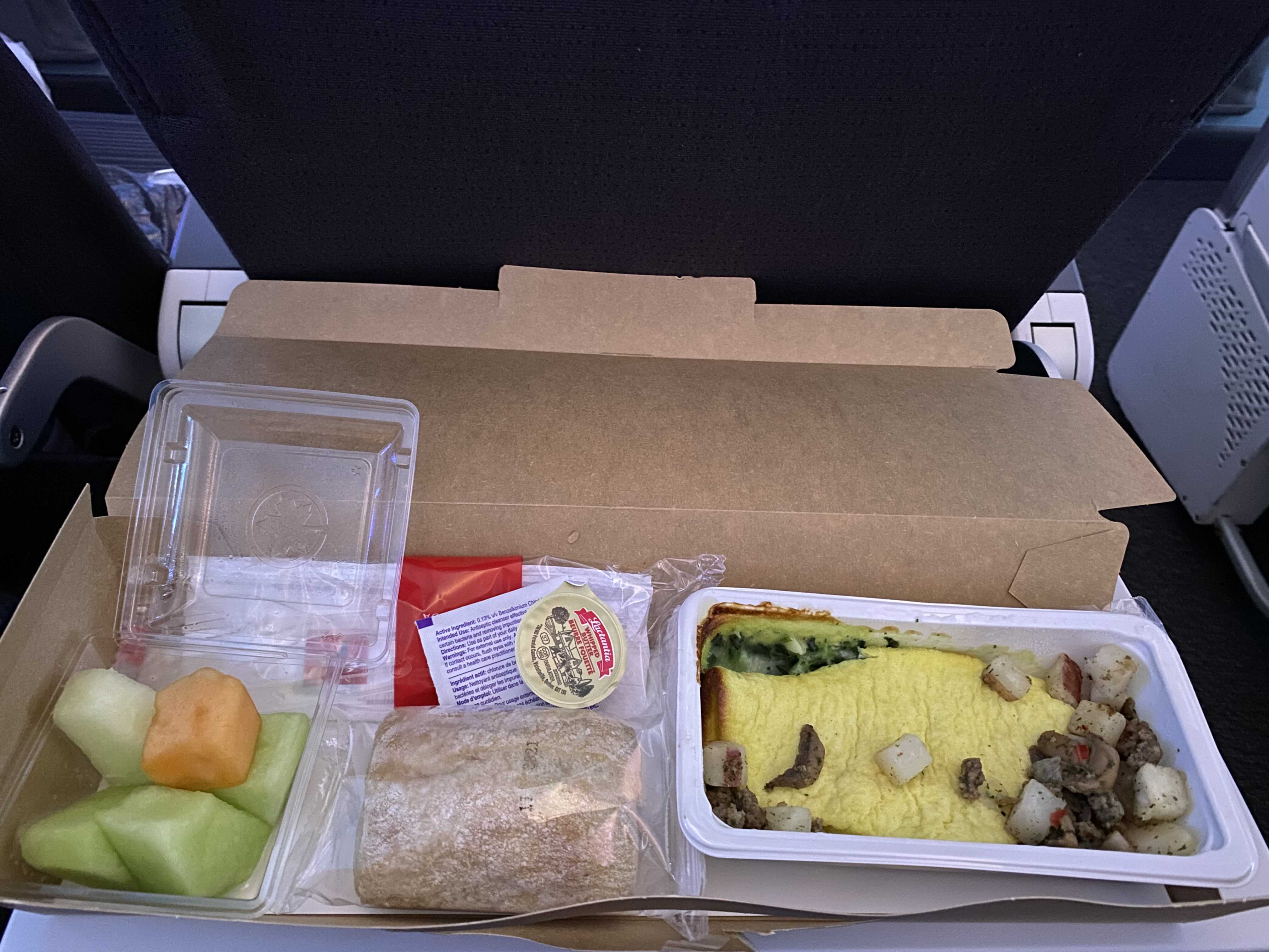 두번째 기내식. 오믈렛과 버섯, 감자 등을 볶은 것이었는데 맛은 괜찮았으나 제 속이 별로 안좋아서 조금만 먹고 과일만 다 먹었네요. (아무래도 잠을 못자서 예민해져서 그런지 소화가 안되는 느낌이었습니다.)