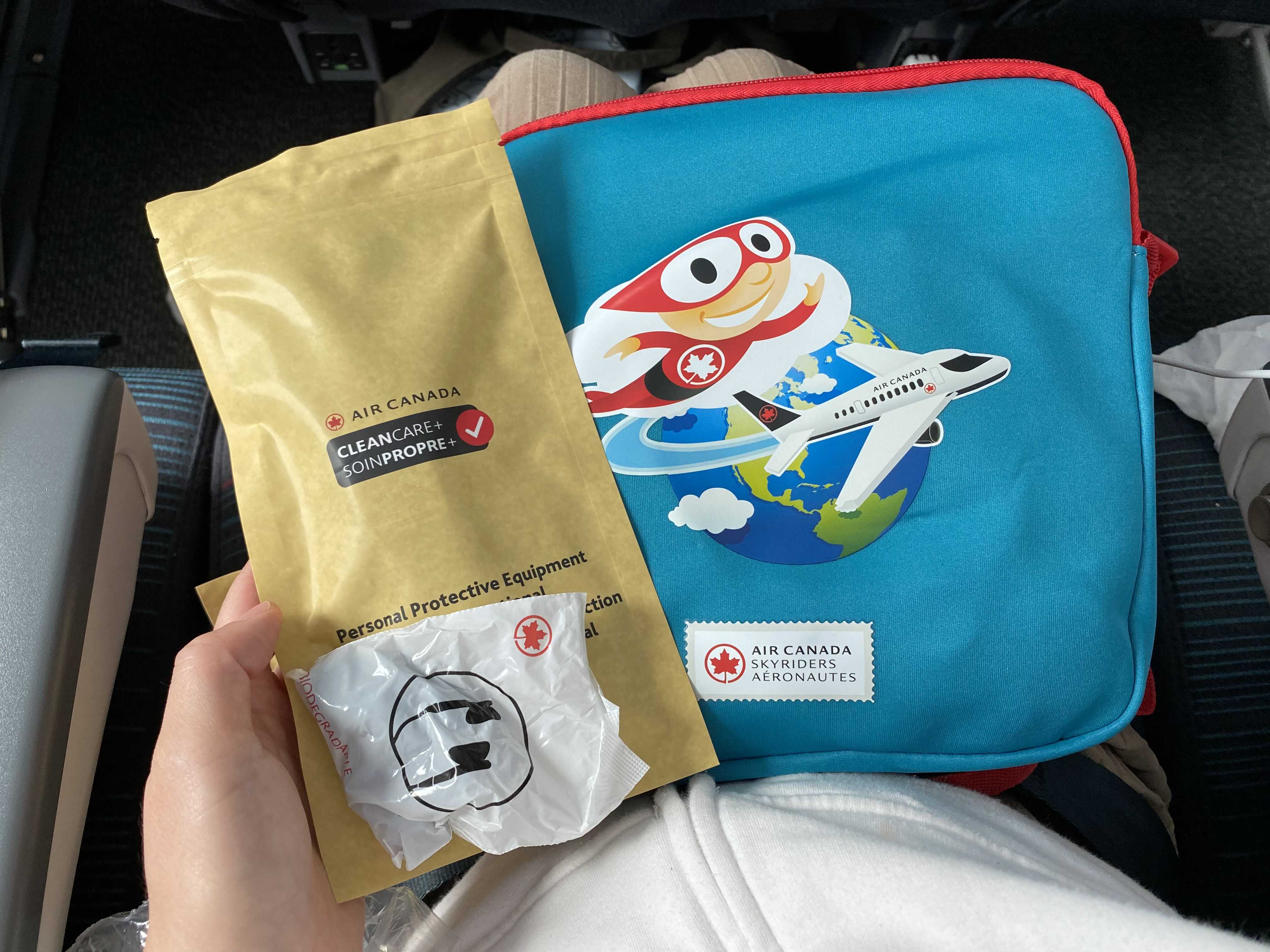 에어캐나다에 탑승하면 방역키트(왼쪽)를 줍니다. 그안엔 마스크와 손 소독제, 스프레이, 이어폰 등이 들어있습니다.